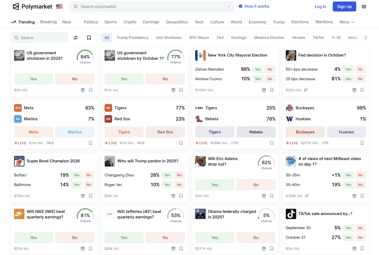 如今,Prediction Market 的覆盖面早已突破政治:投资者可以押注特斯拉的财报是否超预期、美联储是否降息 25/50 个基点、甚至是 Taylor Swift 是否会在 2025 年怀孕。
