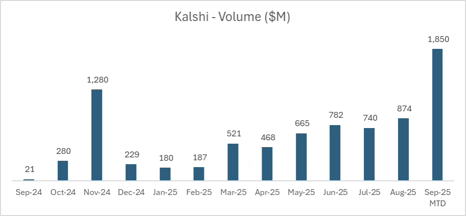 目前 Kalshi 的交易量中约 85–90% 来自体育合约。按月度 run-rate 约 $2B计算,季度约 $6B,年化约 $25B。作为对比,美国体育博彩市场规模约 $150B,其中 FanDuel 占 40–45%,DraftKings 占 30–35%。两者的活跃用户约 300 万,而 Kalshi 通过 Robinhood 的分发可触达 1300 万 MAU,正在长尾市场对 Flutter 和 DraftKings 发起冲击。