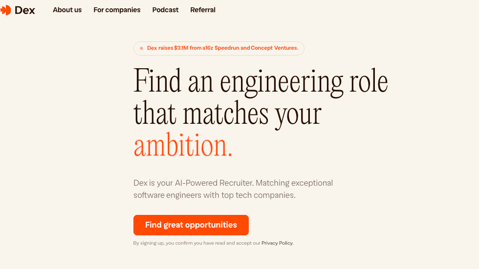 第三/四个则是 Dex 和 Ezra,分别在招聘 / 人才自动化方向。人力资源 /招聘流程自动化,一直是很多企业刚需。市场广阔、用户痛点明显;相对其他前沿技术,入门门槛稍低,推广更快。若 AI 面试官(Ezra)或 AI 招聘工具(Dex)能显著提升效率、降低偏见、节省成本,它们有很强的落地可能。