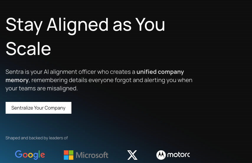 第一个是 Sentra — “AI Alignment Officer / Company Memory / 安全 & 对齐”。它提供一个统一的“公司记忆”系统(connections to tools, track commitments,提醒任务等)来帮助团队在快速变化中保持一致。