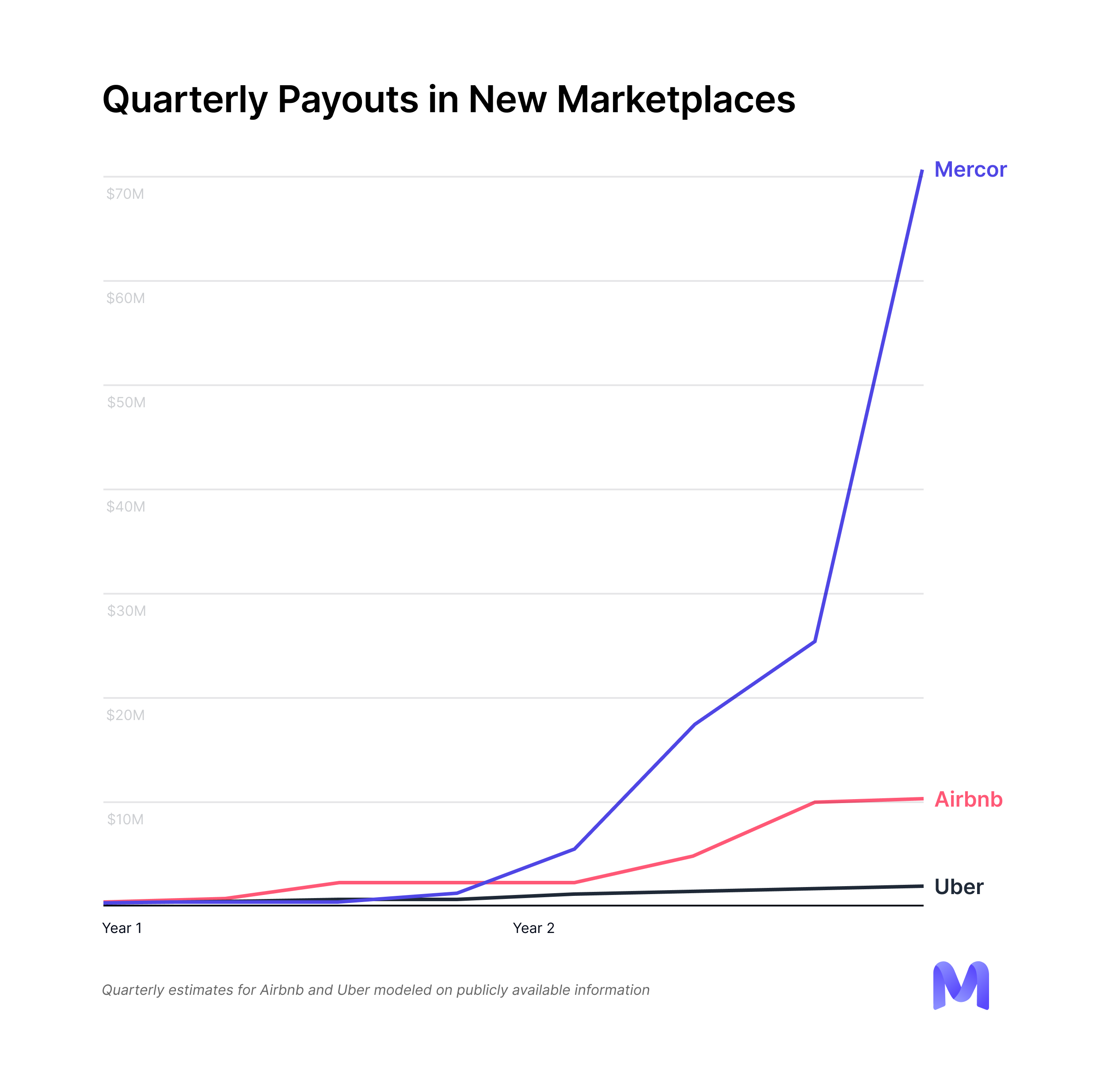 此次给我印象最深的可能是下面这张图,展示了 AI 时代的 Marketplace 的一些特征和成长速度,其平台目前有 3 万多名人才专家,但 Mercor 现在每天向这些人才支付的费用已经超过了 150 万美金。