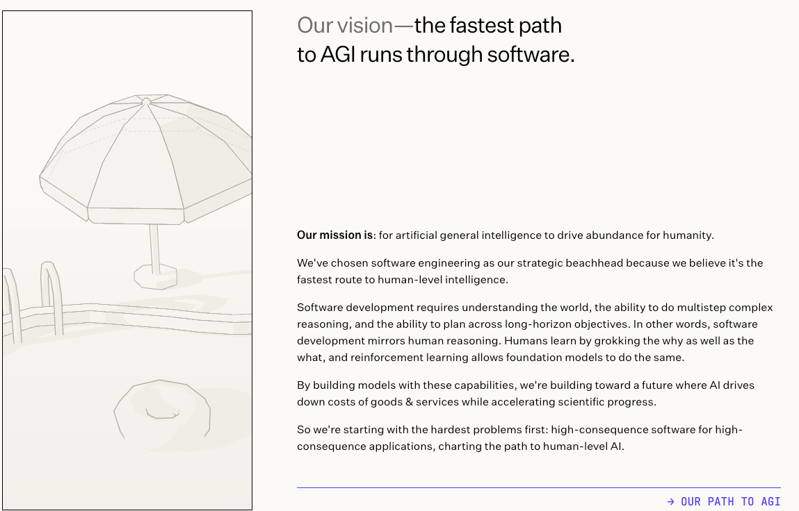 然而,Poolside 的创始人很快意识到,仅仅依靠“扩大语言模型规模”来达成 AGI 存在局限。在 2025 年中,Poolside 公开宣布了其更宏大的愿景:通过软件开发这条路径实现 AGI。