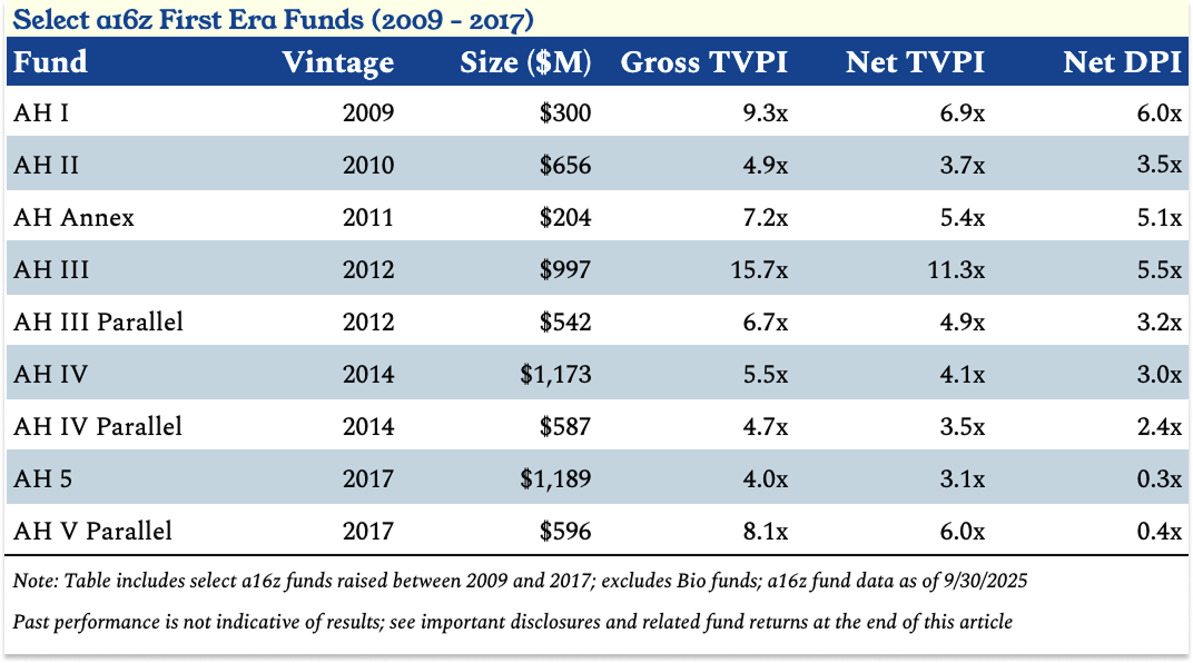 从 AH 3 开始就一直是 a16z LP 的一位负责人说,他们对稳定的(净)3 倍(TVPI)基金非常满意,偶尔是(净)5 倍+(TVPI),这就是他们所交付的。a16z 是少数能够在长期范围内大规模实现这种表现的公司之一。