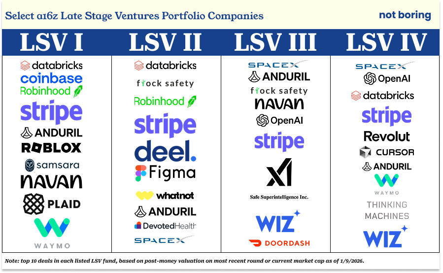 其次是Coinbase,它为 a16z 的 LPs 带来了 70 亿美元的总分配收益。最后就是捕获独角兽的行业地位,我上一篇文章里提到,在过去十年中,a16z 投资了 56 家独角兽企业,数量超过其他任何机构。它是目前全球估值最高的 15 家私人企业中 10 家的投资者(包括 OpenAI, SpaceX, xAI, Stripe 等)。