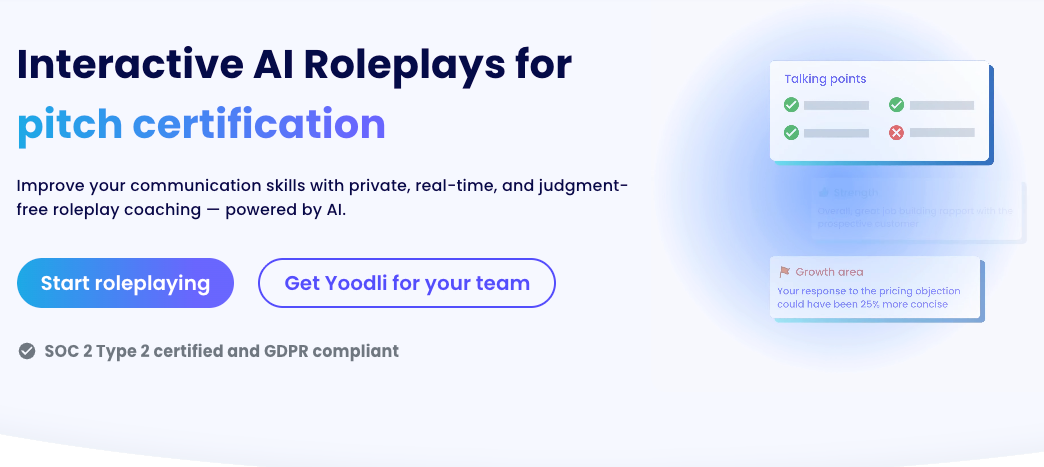 Yoodli 的核心产品是一套“AI 角色扮演 + 沟通训练 + 反馈分析”平台。用户可以通过它模拟销售电话、面试、领导力辅导、反馈会议等真实情境,以 AI 作为对话伙伴练习表达、语速、逻辑、说服力等沟通技巧,并在结束后获得结构化反馈。